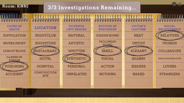 During the presentation phase, each player creates a story of how the murder was committed and how it relates to the clues from the Forensic Scientist.